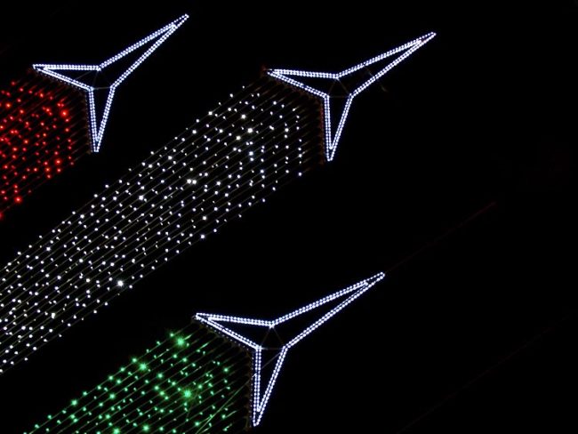 Le coreografiche luminarie, omaggio alle Frecce Tricolori, in occasione del 150° anniversario dell’unità d’Italia.