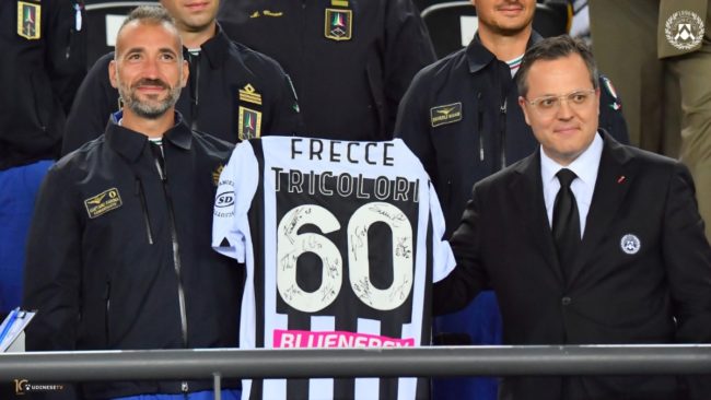 Una maglia bianconera come è tradizione dell’Udinese, ma sulla schiena porta una scritta e un numero particolare: “Frecce tricolori 60”. E’ quella realizzata dall’Udinese in occasione dei 60 anni della Pattuglia acrobatica.