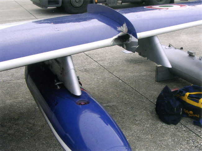 La formazione era decollata per il volo di manifestazione a Fano. Passati alcuni minuti, mezzi antincendio, a sirene spiegate, si erano schierati lungo la pista in quanto era in atto un’emergenza. Il velivolo n°2, quello di Jan Slangen, stava rientrando perché l’impatto con un volatile che gli aveva procurato uno squarcio sul bordo d’entrata della semiala sinistra
