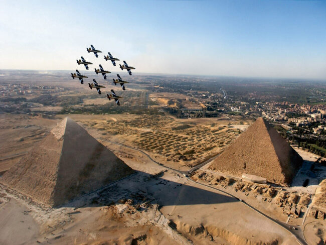 Sbucano dal sole, che sta tramontando sulle Piramidi: all’inizio appaiono come una macchia grigia indistinta nel cielo, che man mano diventa piu’ chiara ed i fumi alle loro spalle cominciano a colorarsi di bianco, rosso e verde, fino a quando si presentano, sulla riva destra del Nilo, al pubblico, che applaude sorpreso.