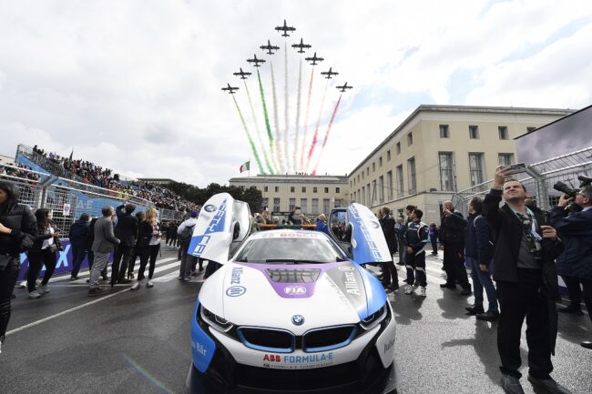 Spettacolo non solo sul circuito, ma anche nel cielo di Roma. La prova di Formula E salutata dal passaggio delle Frecce Tricolori dell’Aeronautica Militare Italiana