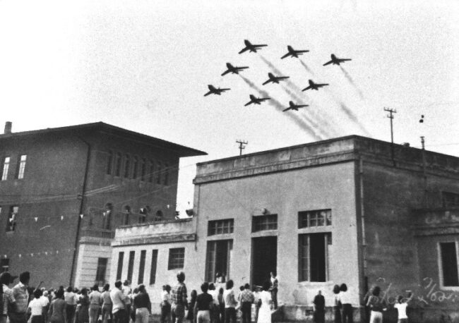 Sono le 18.15 precise, nel cielo verso Redipuglia si delineano nove puntini impeccabili nell’assetto di squadra che ingrandiscono a vista d’occhio; alcuni brevi istanti, un rumore assordante e sopra il complesso scolastico di via d’Annunzio sfrecciano i nove apparecchi della Pattuglia Acrobatica nazionale lasciando dietro luna lunga coda nera…