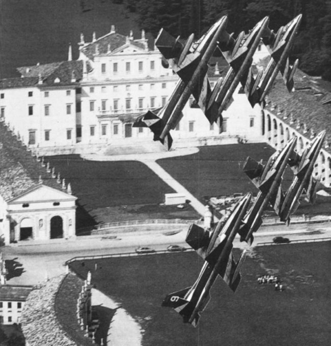 Il tenente colonnello Bernardis, sul seggiolino anteriore, alza le mani e mi ordina di fare Io stesso, cosi l’armiere può avvicinarsi alle ali e togliere le sicure ai cannoncini, alle razziere e al portabombe senza rischiare di venire sbrindellato da un nostro gesto imprudente.