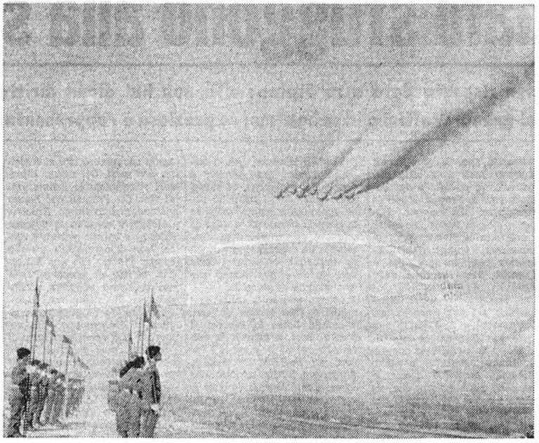 I nove aviogetti Fiat 6.91 della pattuglia acrobatica «Frecce tricolori» hanno sorvolato ieri…