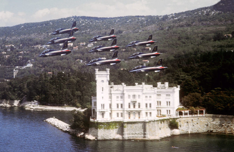 Il volo delle Frecce Tricolori sul Colle di San Giusto (nell’immagine Italfoto), la…