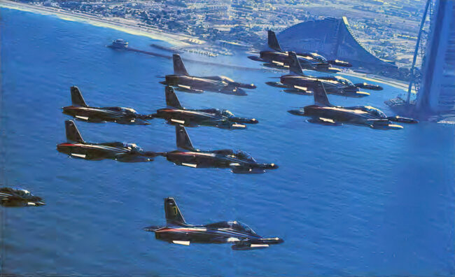 Sarebbe facile dire che la squadra delle Frecce Tricolori tende ad avere la testa tra le nuvole più che i piedi ben piantati per terra. Appena 24 ore dopo essere atterrato a Dubai, il team di 10 piloti è decollato per mostrare alla folla sbalordita a Dubai 2001 quanto siano bravi a volare gli italiani.