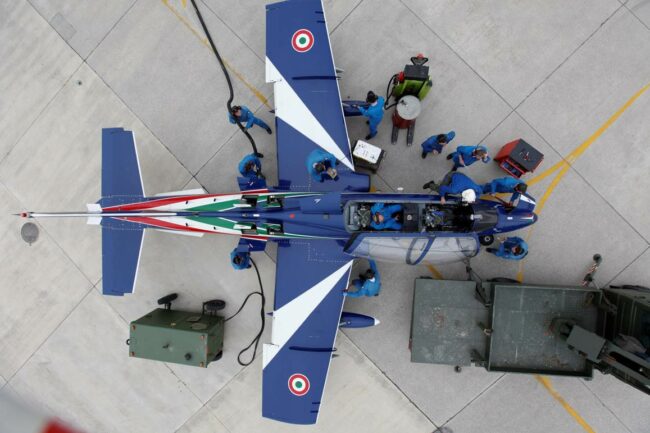“Pronti con i freni…..via!”. È questo il comando con cui Pony 1, il capo formazione delle Frecce Tricolori, dà via radio l’ordine di partenza ai 10 MB-339 PAN, schierati sulla pista per iniziare la corsa di decollo che li porterà sul cielo della loro esibizione acrobatica.