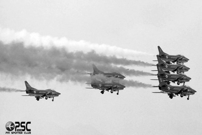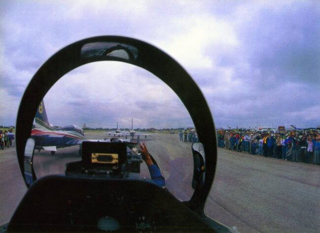 Ore 10.50: all’orizzonte assolato e senza un filo di vento si scorgono un po’ sfumate dodici sagome scure. Sono quelle degli MB339 della Pattuglia acrobatica nazionale ormai sul «sentiero» della pista della base del 313.o gruppo di addestramento acrobatico